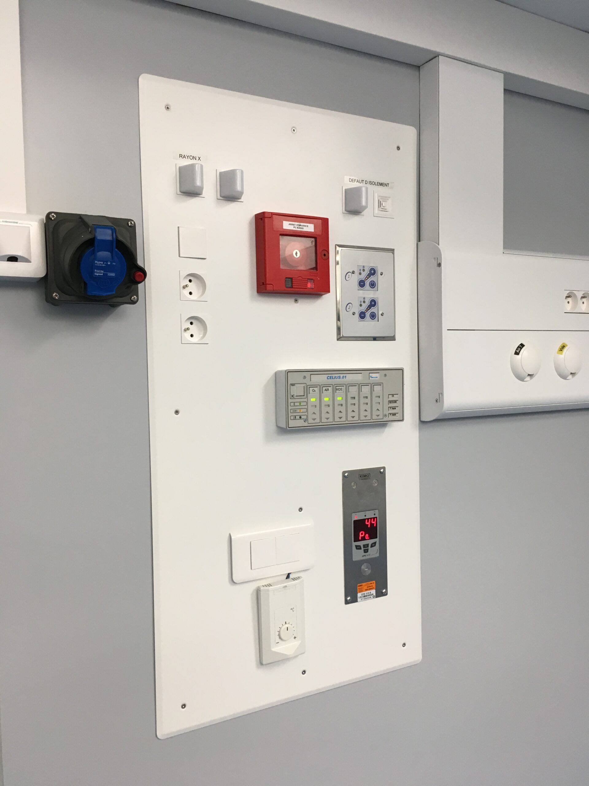 La gaine technique encastrée MULTIDYS est entièrement conçue sur-mesure. Fabriquée en inox ou en acier poudré RAL 9016, elle permet d’assumer le doublage des différents équipements du bloc opératoire.